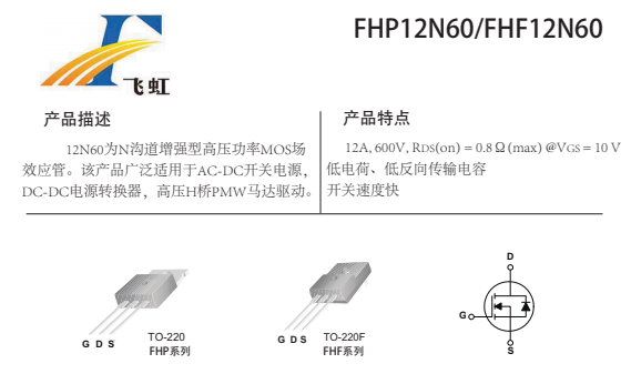 FHP12N60的主要封裝形式是TO-220、TO-220F,腳位排列位GDS。這款12N60場(chǎng)效應(yīng)管產(chǎn)品具體參數(shù):Vgs(±V):30;VTH(V):2-4;ID(A):12;BVdss(V):600。RDS (on) = 0。8mΩ(typ)@V GS =10V,低電荷、低反向傳輸電容開(kāi)關(guān)速度快。