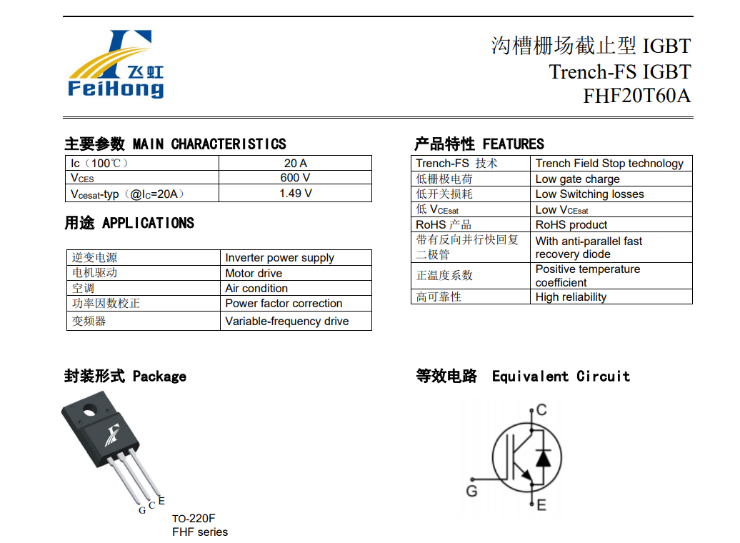 目前飛虹半導(dǎo)體的FHF20T60A型號(hào)IGBT產(chǎn)品參數(shù)特點(diǎn)為: