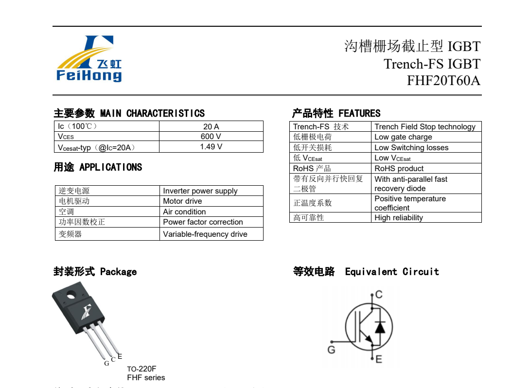 FHF20T60A是一款場N溝道溝槽柵截止型IGBT,使用Trench Field stop Ⅱ technology 和通過優(yōu)化工藝,來獲得極低的 VCEsat 飽和壓降。